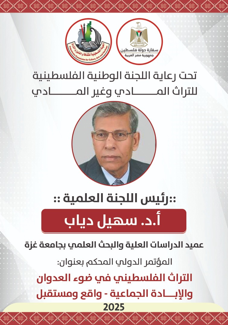 تنظم سفارة دولة فلسطين بالقاهرة، بالتعاون مع الهيئة الفلسطينية للثقافة والفنون والتراث، وتحت رعاية اللجنة الوطنية الفلسطينية للتراث المادي وغير المادي، المؤتمر الدولي المحكَّم “التراث الفلسطيني في ضوء العدوان والإبادة الجماعية – واقع ومستقبل”، بمشاركة نخبة من الأكاديميين والباحثين والمختصين من فلسطين والدول العربية والعالم.