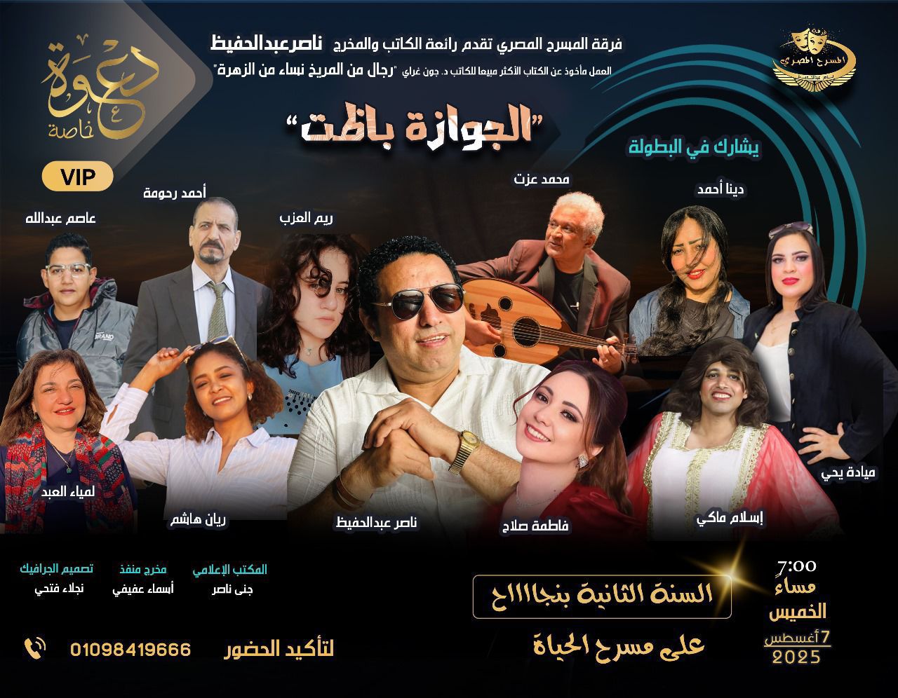 ضمن فعاليات أسبوع المسرح الثري الذي تنظمه فرقة المسرح المصري، بقيادة الكاتب الصحفي الفنان ناصرعبدالحفيظ يُعرض مساء الخميس 7 أغسطس على خشبة مسرح الحياة بوسط القاهرة العرض الكوميدي الاجتماعي “الجوازة باظت”، في تمام الساعة السابعة مساءً، بمشاركة نخبة من نجوم الفرقة.
