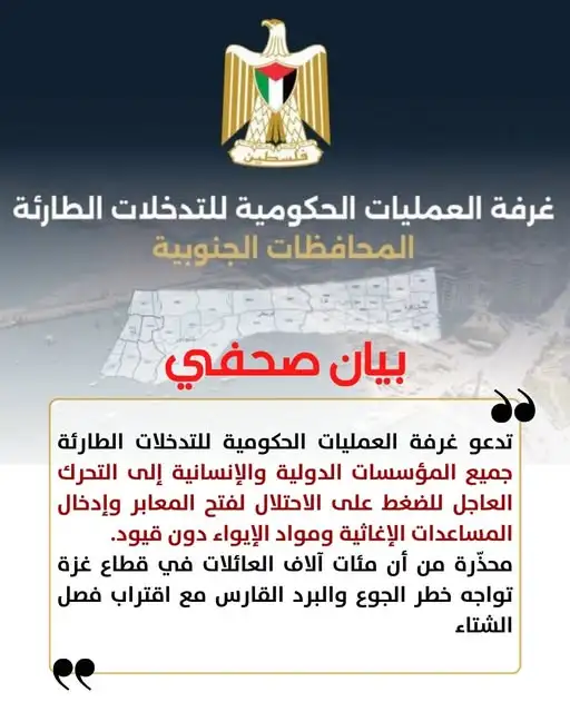وطالبت رئيسة غرفة العمليات الحكومية للتدخلات الطارئة، الدكتورة سماح حمد، المجتمع الدولي والأمم المتحدة ووكالاتها والمنظمات الدولية بالتحرك الفوري والضغط على الاحتلال لفتح جميع المعابر البرية دون قيود، والسماح بإدخال المساعدات الإنسانية بشكل آمن ومنتظم، بما في ذلك مواد الإيواء والخيام والمنازل الجاهزة، وضمان إدخال مستلزمات الصحة والتعليم والمياه لإعادة بناء منظومات الحياة الأساسية في القطاع، وضمان وصولها إلى جميع المناطق المتضررة دون تأخير.