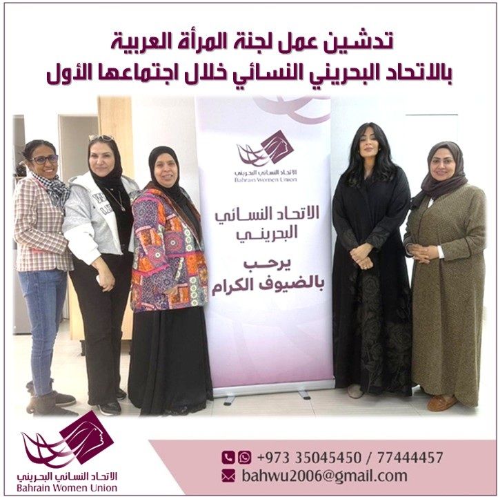 عقدت لجنة المرأة العربية التابعة لـ الاتحاد البحريني النسائي اجتماعها الأول بمقر الاتحاد النسائي البحريني، برئاسة الدكتورة سمية الجودر، وبحضور العضوات فوزية ربيعة، وهيبة عبدالرحمن الفارسي، زهرة اشكناني، والمهندسة أميرة الحسن، وذلك في إطار تدشين عمل اللجنة وبحث توجهاتها المستقبلية ضمن رؤية عربية مشتركة.