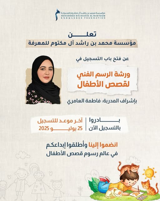 تعلن مؤسسة محمد بن راشد آل مكتوم للمعرفة عن فتح باب التسجيل في ورشة الرسم الفني لقصص الأطفال بإشراف المدربة فاطمة العامري.