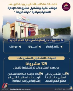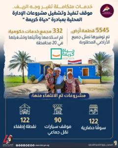 وأكد الإنفوجراف أن هذه الجهود تأتي في إطار تنفيذ رؤية الدولة المصرية لتحقيق التنمية الشاملة والمستدامة، وتعزيز كفاءة الخدمات المحلية، وتحسين مستوى معيشة المواطنين في القرى والمناطق الأكثر احتياجًا، ضمن أهداف مبادرة «حياة كريمة».