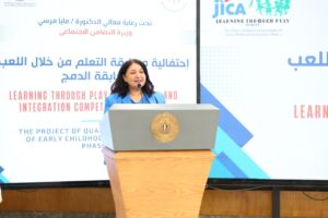 وفى كلمته أعرب جينتارو يا زاكي النائب الأول لرئيس مكتب “جايكا مصر” عن سعادته بهذا الإنجاز الملحوظ للميسرات المشتركات بالمسابقة، مشيرا إلى التعاون المثمر مع وزارة التضامن الاجتماعي عبر مشروع تحسين جودة خدمات الطفولة المبكرة، والذي يشهد تنفيذ مرحلته الثانية ويستهدف الارتقاء بالخدمات المقدمة وتمكين الميسرات وتوفير بيئة تعليمية نموذجية من خلال التعلم عبر اللعب .