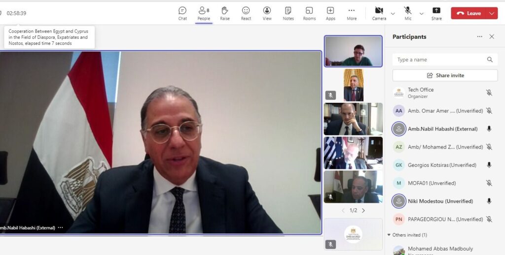 التقى السفير نبيل حبشي، نائب وزير الخارجية للهجرة وشئون المصريين بالخارج، عبر الفيديوكونفرانس مع السيد جورجيوس كوتسيراس، نائب وزير الخارجية اليوناني، والسفيرة ثيودورا كونستانتنيدو، رئيس خدمة القبارصة في الخارج والعائدين للوطن، بحضور سفيري مصر باليونان وقبرص والسفير اليوناني بالقاهرة، لبحث التعاون المشترك فى مجال المغتربين، وعلى نحو يشمل المبادرة الرئاسية “احياء الجذور – NOSTOS”.