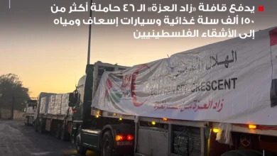 الهلال الأحمر المصري يدفع قافلة «زاد العزة» الـ 46 حاملة أكثر من 150 ألف سلة غذائية وسيارات إسعاف ومياه إلى الأشقاء الفلسطينيين