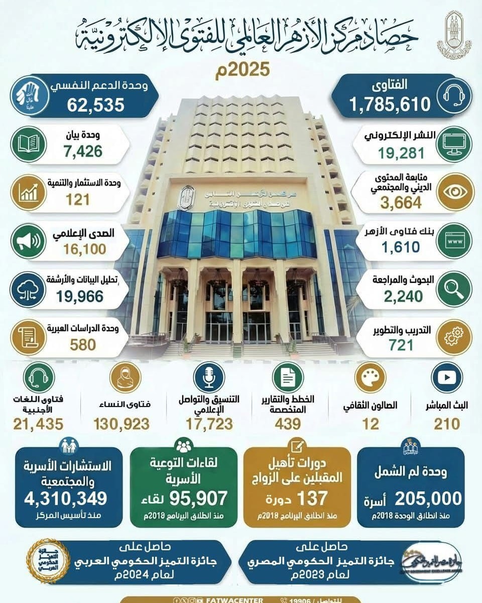 The infographic confirmed that these integrated efforts contributed to the Al-Azhar Global Center for Electronic Fatwa receiving the Arab Government Excellence Award in 2024 and the Egyptian Government Excellence Award in 2023, in recognition of its institutional role in serving society and consolidating the approach of moderation and balance.