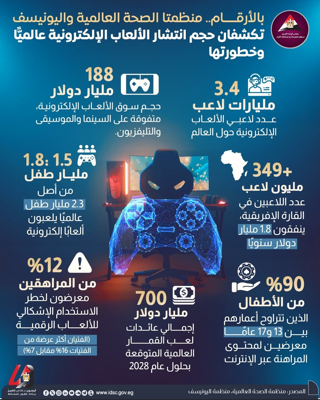 The Information and Decision Support Center (IDSC) has released an infographic highlighting findings from the World Health Organization (WHO) and UNICEF regarding the global spread of electronic games and their growing health and social risks, based on unprecedented numbers that reflect the scale of the phenomenon and its increasing impact on children, adolescents, and societies.