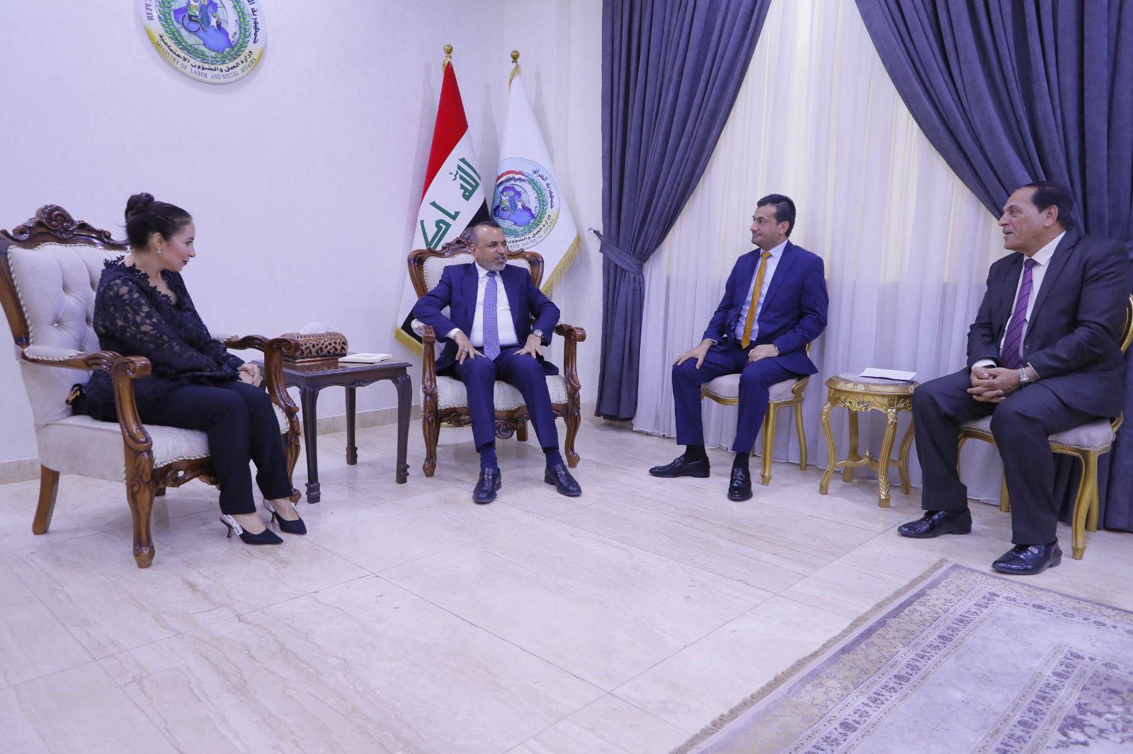 وقال خلال استقباله الأمين العام للاتحاد العربي للنقابات، ممثلة الاتحاد الدولي للنقابات الدكتورة هند بن عمار، وبحضور رئيس المجلس النقابي العمالي كريم لفته: إن الوزارة أسست منتدى الحوار الاجتماعي الذي عقد أربع جلسات لتقريب وجهات النظر، فضلاً عن تشكيل مجلس تنسيقي بهدف الوصول إلى صيغة تنظيمية موحدة وفعّالة. وأوضح أن التمثيل النقابي الكامل يجب أن يشمل منتدى الحوار الاجتماعي ومجلس إدارة صندوق تقاعد وضمان العمال والتفتيش العمالي.