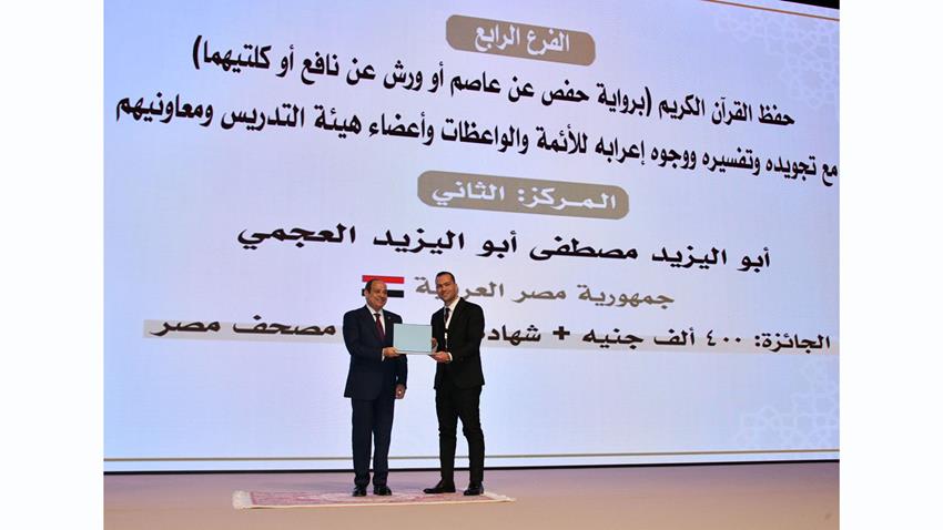 وذكر السفير/ محمد الشناوي، المُتحدث الرسمي، أن السيد الرئيس قام خلال الاحتفالية بتكريم الفائزين في المسابقة العالمية الحادية والثلاثين للقرآن الكريم، في فروع الحفظ والتجويد والتفسير ومعرفة أسباب النزول، وأيضًا لحفظة القرآن الكريم وتجويده للناطقين بغير اللغة العربية، كما تم تكريم حفظة القرآن الكريم من ذوي الهمم.